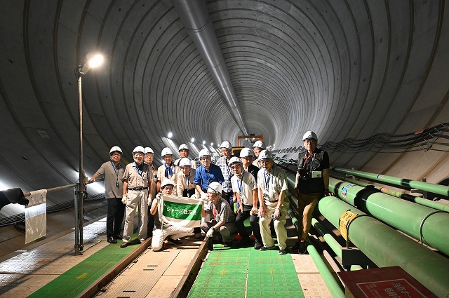 中野区野方5丁目地内を流れる妙正寺川と環七通りが交差するところに内径26mにも及ぶ巨大な立坑がありました。そこから50mほど下にもぐると、内径12.5mの貯留用トンネルが出現。見学者一同から驚きの声が上がりました。“個人では行きにくいところの見学ができる”とのお声を頂いている第1ブロックのイベントですが、今回は東京都が治水対策整備事業として進めている環状七号線道路の地下空間を利用した調節池工事の現場を見学しました。