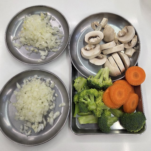 今回、ハンバーグ材料は一人分づつとなりますが、ハンバーグの付き合わせの野菜は二人分づつ用意を頂いています。ここが頭を使うポイントです。ハンバーグ自体は一人づつ作りますが、付き合わせは二人で協力して作ります。