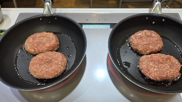 フライパンに油を入れて温め、くぼみを付けた面を上にしてハンバーグを中火で焼きます。