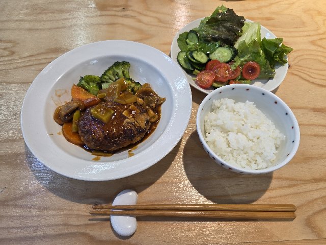 ソースが煮詰まり粘りが出たらハンバーグをお皿に盛りつけます。付け合わせのブロッコリーとにんじんも盛り付け、最後にソースをハンバーグにかけるたら「煮込みハンバーグ」完成です。